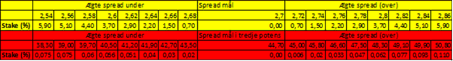 Ovenstående tabel viser tydeligt, at man skal stake en væsentlig mindre andel af sin bankroll på mål i tredje potens sammenlignet med markedet for mål. På målspreadet kan man også se, at der er en rimelig symmetri, og man kan derfor stake det samme både på over og under markedet ved den samme edge. På mål i tredje potens gør det samme sig ikke gældende. Her kan det ses, at hvis man har værdi på under, kan man ikke blive ved med at øge sine indsatser. Dette skyldes, at ”risk of ruin” vægter højt i beregningen. På over kan man dog blive ved med at øge indsatsen med edgen. Dette er måske lidt i modstrid med, hvad man kunne forvente, da underen vil gå hjem oftere end overen på mål i tredje potens (dette beskrev jeg i sidste indlæg).